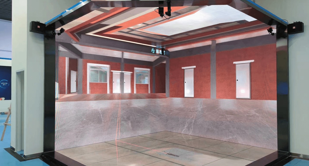 CAVE屏是由3面以上的高清LED显示屏或硬质投影墙组成的高度沉浸式虚拟演示环境,配合六自由度空间位置跟踪器,用户可以在被显示墙包围的环境中近距离接触虚拟三维物体,或者随意漫游在“真实”的虚拟环境。CAVE屏可以应用于任何具有高度沉浸感需求的虚拟仿真应用领域。如虚拟设计与制造、虚拟装配、虚拟建筑视景与城市规划等。
